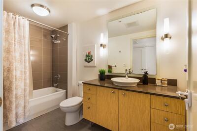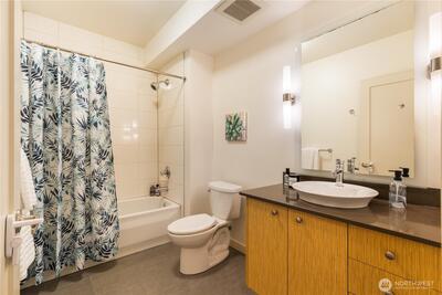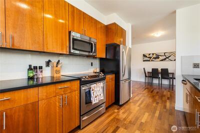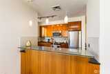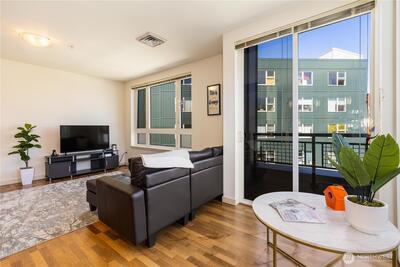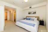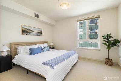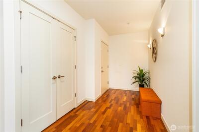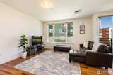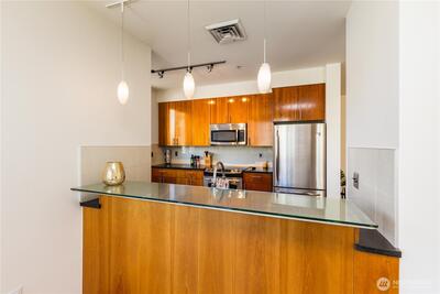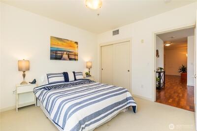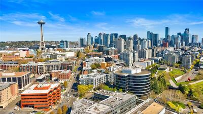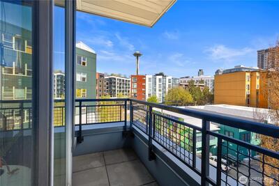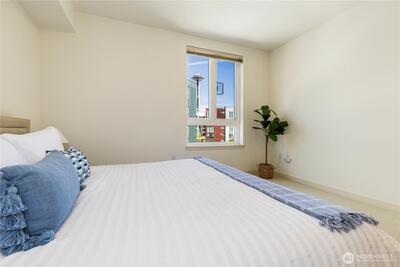 Imagine coming home everyday to the view of the iconic Seattle Space Needle & Elliott Bay. It can be yours to enjoy 365 days a year! There is true luxury living in this 2bd 2bath top floor unit. Open floorplan with Walnut hardwood flooring throughout entry, kitchen, dining & living room. Carpet in bedrooms. Primary bedroom boasts an ensuite bath & dual closets. Newly refaced walnut kitchen cabinets, freshly painted home and a brand new furnace. Central AC to be enjoyed in the warm summer months and a patio to watch the annual NYE fireworks. All appliances to stay. Underground parking, an extra storage unit, onsite concierge, rooftop gardens, bbqs and spacious gathering areas. Urban living at its best!