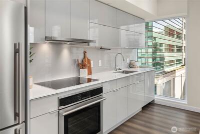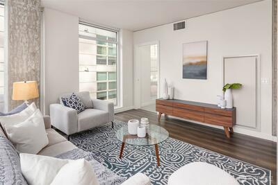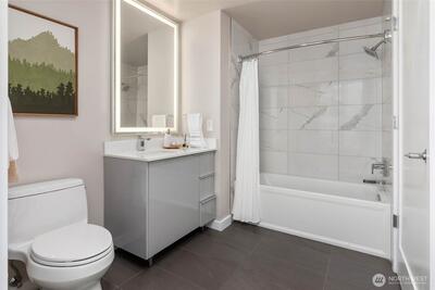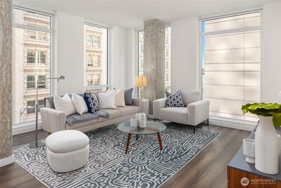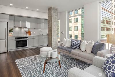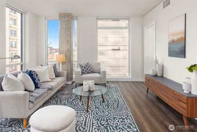 Welcome to KODA—a bold, modern high-rise in Seattle’s vibrant International District. Thoughtfully designed homes feature generously lofted floor-to-ceiling windows, smart layouts, and sleek finishes. This one bedroom, two bathroom + Den home features a spacious, open layout and corner windows maximizing natural SE exposure. Price includes one reserved parking spot, one storage unit. Enjoy unmatched amenities: a wellness center, rooftop terrace with sweeping views, coworking lounge, guest suites, and Club KODA with a theater, kitchen, and dining space. Steps from light rail, Uwajimaya, stadiums, and downtown, KODA blends urban energy with authentic cultural roots. Live where heritage meets modern living.
