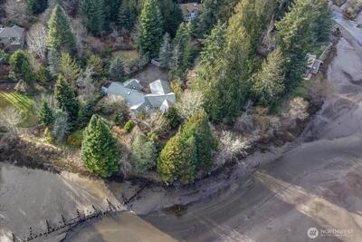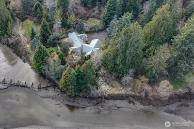 Sophisticated waterfront home on 495 feet of tidal frontage of which 300 is low-bank, In Minter. Set on 3.77 acres transformed 35 years ago by a Master Gardener into a private arboretum. Mature trees—inc. a 40-ft. redwood—now provide exceptional privacy while allowing selective trimming to enhance sweeping views up Minter Bay into Carr Inlet/Henderson Bay, with Rosedale & Gig Harbor in the distance. The lagoon teems with wildlife: eagles (up to 12 at once), otters, geese, ducks, occasional seals, & a visible salmon run passing just 10 feet away at low tide en route to the state hatchery at Minter Creek. The far end of the lagoon borders Minterbrook Oyster Co. 2,915 sq ft of single-level living (exc. garage), the home features three bedrooms, each with a private full bath, plus a guest half bath. Living & media rooms each have wood-burning fireplaces. The kitchen sits beside a casual nook, with a formal dining room steps away. Six skylights enhance natural light. A laundry room with