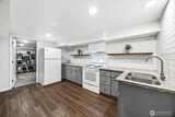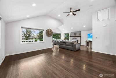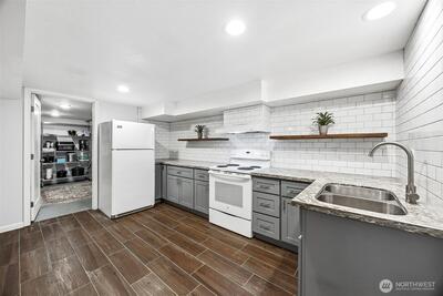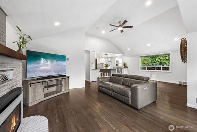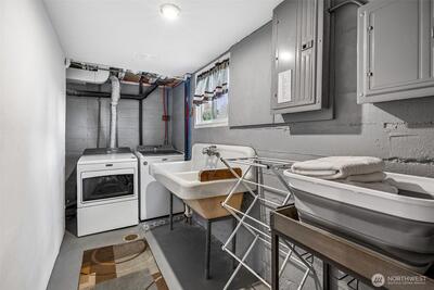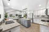 Rare opportunity in the highly admired Clinton Park / Interlaken neighborhood. This charming 1940s vacation cottage has been beautifully updated and includes a fully finished basement ADU—perfect for multi-generational living, guests, or rental income. Featuring 4 bedrooms, 3 bathrooms, two kitchens, and open living and dining areas, the home offers flexibility and comfort on every level. Both main and lower floors provide separate laundry areas and versatile spaces ideal for a home office. The main kitchen flows seamlessly to a stunning stone patio, creating an inviting setting for outdoor entertaining or quiet evenings. Set on a fully fenced corner lot of over 1/3 acre, the property boasts a private, park-like setting with mature heirloom trees and established rhododendron hedges, capturing the neighborhood’s classic charm. A spacious detached garage with attic storage and a long gated driveway offer ample room for RV or boat parking. Enjoy easy access to outdoor recreation—a