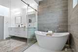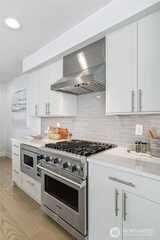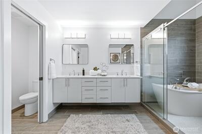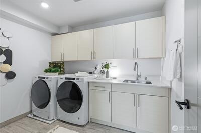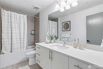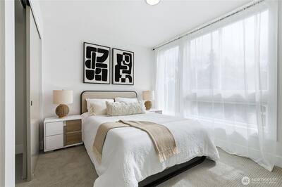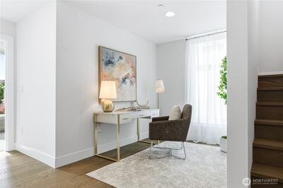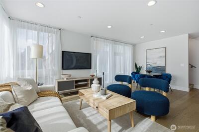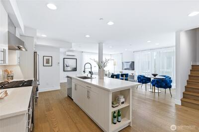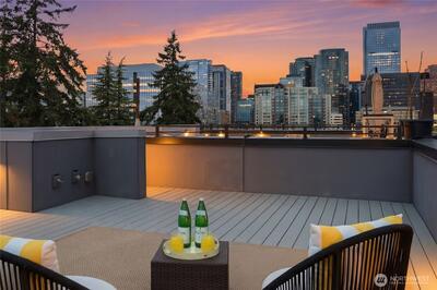 Upscale, view & convenience! Nestled in a serene enclave just steps from downtown, this stunning 3-bedroom plus Den end-unit offers the perfect blend of urban lifestyle and peaceful retreat. Luxurious amenities, open floor plan, walls of windows & sunlit rooms. A gourmet kitchen featuring high-end Viking appliances, undercabinet lighting, quartz countertops, and sleek modern finishes, all flowing seamlessly into the family and dining spaces—perfectly designed for both everyday living and entertaining. The primary suite is a true sanctuary, Oversized room with a sitting area, and a beautifully remodeled spa-inspired bathroom with heated floors, a soaking tub & tile wall wrapped shower room. The crowning jewel is the sparkling views from private rooftop deck, featuring a gas grill stub and breathtaking 360-degree Seattle & Downtown Bellevue skyline and mountain views, perfect for entertaining or unwinding above the city. Designed for modern living, the home includes smart features,