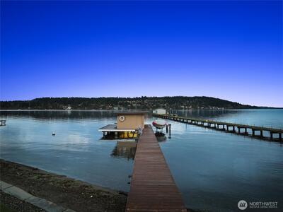 Set on a beautiful, level 13,756 square foot parcel with 43 feet of prime no-bank frontage, this 2 bedroom, 2 bath bungalow offers an exceptional opportunity to enjoy life on the water in the heart of Lake Forest Park’s highly sought-after Sheridan Beach neighborhood. The 1,590 square foot, one-and-a-half story home, originally built in 1929, has been thoughtfully updated over the years and features a recently renovated kitchen and bathrooms that blend modern tastes with the home’s timeless character. Gleaming hardwood floors & light-filled living spaces opens to a generous waterside entertaining deck—perfect for taking in the ever-changing lake views and spectacular sunrises. A level lawn stretches to the water’s edge and the 110-foot shared dock, complete with boathouse with boatlift & 2 jet-ski lifts, providing easy access to the lake for boating, swimming, and waterfront recreation. Two-car garage and additional off-street parking add everyday convenience. Perfectly located