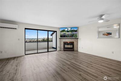 Location wins here — and this beautifully remodeled condo delivers. Steps from Good Samaritan Hospital with quick access to Hwys 512, 167, and 410, plus South Hill Mall, Bradley Lake Park, and the Puyallup Farmers Market right around the corner. This split level unit serves up sweeping views of Puyallup, Tacoma, the Olympic Mountains, and the valley from both the living area and deck — with a lower patio for bonus outdoor space. Inside, enjoy all-new laminate hardwood floors, a fully remodeled kitchen with pantry, an upgraded bathroom, heated floors, all-new appliances, and a cozy wood-burning fireplace. Mini-split keeps you cool in summer and efficient all winter. The HOA covers water, sewer, garbage, cable package ($260k average savings), pool, yard, and all exterior maintenance — so you can just enjoy it. Bright, open, and ready to entertain.