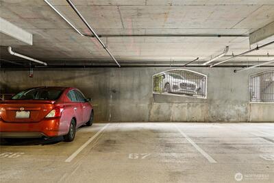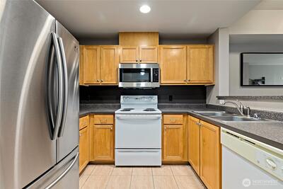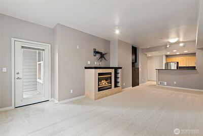Wide open contemporary condo in the heart of downtown Redmond! Just minutes from Redmond Town Center, Bella Bottega, the Sammamish River Trail, bus, and new transit center, this home offers a Walk Score of 9.2 out of 10 with assigned parking in a secure garage from which you can take the elevator directly to your floor. There's additional visitor parking adjacent to a safe controlled entrance and convenient elevator access from a large lobby. Inside, enjoy a bright great room with a cozy fireplace. The large bedroom and bath provide comfortable living, while the balcony offers a relaxing outdoor retreat above a large lawn area. Recent updates include fresh paint, brand-new carpet, and new blinds for a clean, modern feel. The kitchen comes fully equipped with all appliances, including a brand-new high-end Bosch microwave. A recent remodel also added a convenient storage closet. Extras that stay with the home include a large mirror and TV mount. Community amenities include a shared BBQ a