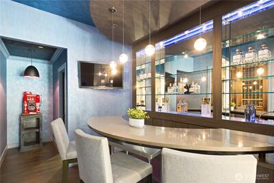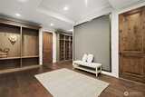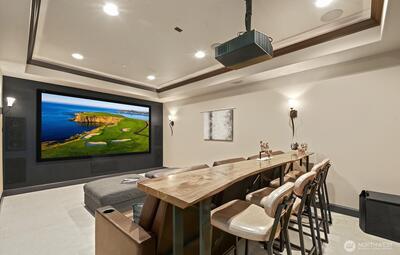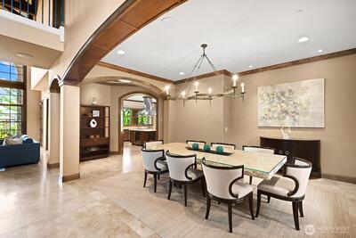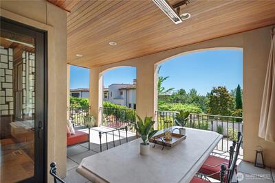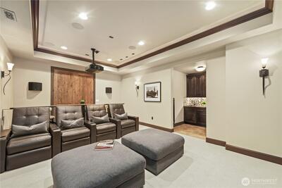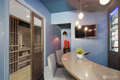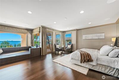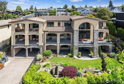 This exquisite view estate embodies luxury living with exceptional design, premium materials, and thoughtful craftsmanship. Glorious views of Lake Washington, city and mountains. The main level welcomes you to formal living and dining, stunning kitchen with large family room, handsome office and en suite bedroom. The upper level hosts 2 flex space rooms plus 4 en suite bedrooms all with individual access to decks including the significant primary suite. The lower level is incredible entertaining space with theatre room, rec room, family room, wine room, bar and en suite bedroom. Elevator services all 3 floors. Parking for 6 cars between 2 garages. Beautifully designed landscape with water features and lighting creating lovely ambiance. All furniture can be included in home purchase.