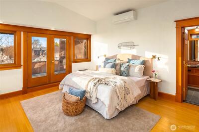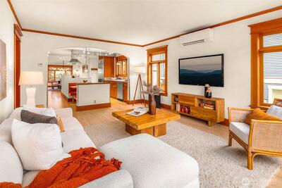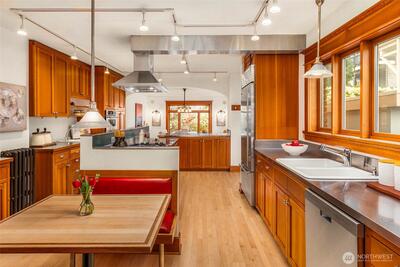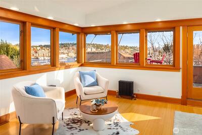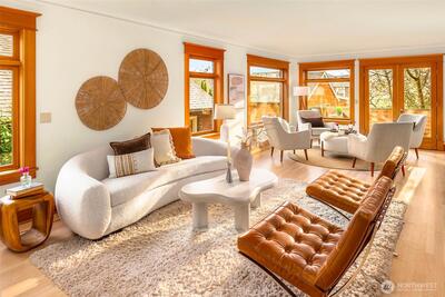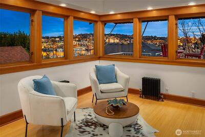 Offered for the first time in 40 years, this remarkable home in the heart of Wallingford blends historic character with striking architectural design. Originally built in 1927 and thoughtfully transformed into a stunning single-family residence with extensive upgrades throughout, the home is beautifully positioned to capture panoramic views of Lake Union and the Seattle skyline. Exceptional craftsmanship and custom design define the interior. Vertical grain fir trim, maple and bamboo floors, and abundant wood windows fill the home with warmth and natural light, while a sculptural steel and maple staircase serves as an architectural centerpiece. Designed for everyday living and entertaining, the chef’s kitchen features Sub-Zero refrigeration, double wall ovens, stainless steel countertops, custom fir cabinetry, and an inviting built-in banquette. A hidden passive wine cellar stores up to 750 bottles, while a daylight MIL suite with a separate entrance offers flexibility for gues