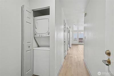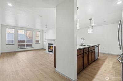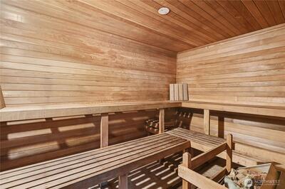 Set in the heart of vibrant Belltown, this beautifully maintained 1-bedroom, 1-bath residence at Alexandria Condominium offers refined city living just moments from Seattle’s iconic waterfront. Inside, the thoughtfully designed 765 sqft layout features large windows that fill the home with natural light, an inviting living room anchored by a cozy gas fireplace, and a dining area with French doors opening to a charming Juliet balcony. The updated kitchen offers island-style breakfast bar seating and stainless steel appliances including refrigerator, stove, dishwasher, and range hood. The spacious bedroom includes a generous walk-in closet, while the updated bathroom features tiled flooring, a new toilet, and updated lighting. Additional highlights include light wide-plank flooring, in-unit washer and dryer, and an assigned parking space in the secure garage. Residents enjoy a range of amenities including a fitness center, sauna, entertainment room, work area, courtyard, and a rooftop