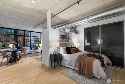 Elevated living at Mosler Lofts in the heart of Belltown. This stylish 1-bedroom, 1-bath, 669sf home features soaring ceilings, refinished floors, and floor-to-ceiling windows that fill the space with natural light while framing Space Needle and city views. The open layout highlights the building’s industrial character, complemented by refinished kitchen cabinetry and modern closet system for improved functionality and storage. Mosler Lofts is known for its boutique industrial design and thoughtfully curated amenities, including a rooftop deck with working garden beds, BBQ grills, fitness center, conference room and library. Ideally located near Olympic Sculpture Park, the Seattle waterfront and Seattle Center, with easy access to Belltown dining, downtown shopping and South Lake Union employers. The offering includes a parking space (with EV charger) in the secured garage and a storage unit. This home is suited for buyers seeking a refined pied-a-terre or a turnkey, low-maintenance