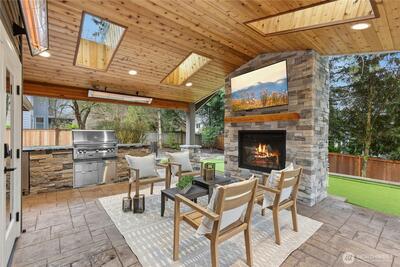 Exceptional design and craftsmanship shine throughout this beautifully updated home, thoughtfully designed for both everyday comfort and effortless entertaining. The heart of the home features a stunning chef’s kitchen with an oversized island, abundant cabinetry, and generous prep space, seamlessly connecting to the main living areas. Just off the kitchen, a spacious walk-in pantry provides excellent storage and organization, with the option to easily serve as wine storage for enthusiasts and collectors. The home offers multiple versatile spaces, including a dedicated home theater wired for sound, a stylish game room, and flexible rooms that can function as home offices, guest spaces, or additional bedrooms. Outdoor living truly sets this home apart. Step outside to a covered patio designed for year-round enjoyment featuring a fireplace, built-in heaters, skylights, and a fully equipped outdoor kitchen with grill and kegerator. The backyard continues to impress with a private put