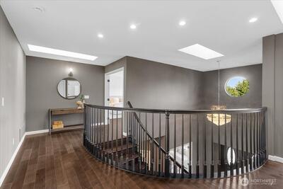 Welcome to this stunning home tucked into a quiet dead-end street in a hidden pocket of West Seattle. A grand staircase and formal living and dining rooms create an elegant first impression. The main floor also features a spacious office or guest bedroom for flexible living. The newly remodeled kitchen is expansive and inviting, with a breakfast island, dual pantries, garden window and abundant storage. It opens to a warm great room with dining space, a cozy media area with gas fireplace, and built-in nooks for art and display. Step outside to a backyard oasis with entertaining decks, a flagstone patio and terraced garden spaces. Upstairs, the impressive primary suite offers a private balcony, sitting area and spa-like five-piece bath with a generous walk-in closet. Three additional bedrooms are spacious and bright. The lower level includes a separate entrance, full kitchen and bath—ideal for an ADU or multi-generational living. Additional highlights include a large two-car garage