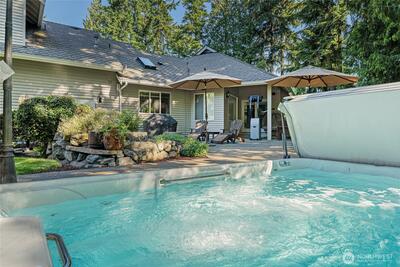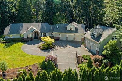 A Hollywood Hill dream come true! Located on 1.97 gorgeous fully fenced acres down a quiet dead end street. Main house is 3,350 sqft plus a newer 700 sqft studio over detached garage (4,050 SQFT FINISHED). Approximately 1,600 sqft of garage space with 5 bays for the car/craft enthusiasts! Very tech savvy home with smart features galore. The sprawling one story living area is finished with hardwoods throughout, three main bathrooms extensively remodeled. Kitchen with top of line appliances (Miele & Wolf), newer granite and Maple Cabinets and open to family room with vaulted ceilings. Architectural comp roof, Custom metal arched entry door, New AC/Heat Pump in main and mini split with AC in Detached studio. The exterior has it all: very large patio, water feature, swim spa, garden, firepit & gated entry. Minutes to everything Woodinville - Wine country, Restaurants, Burke Gilman Trail and Northshore Schools.