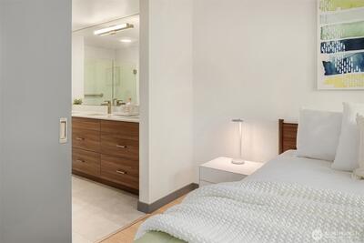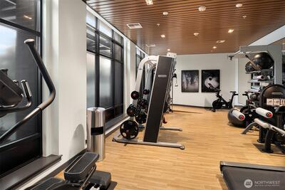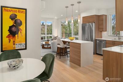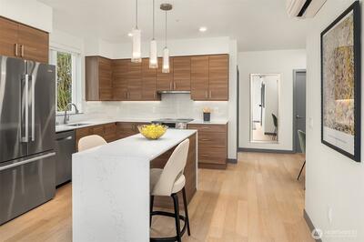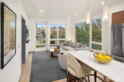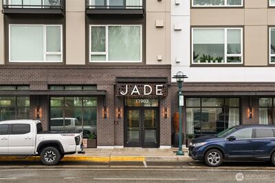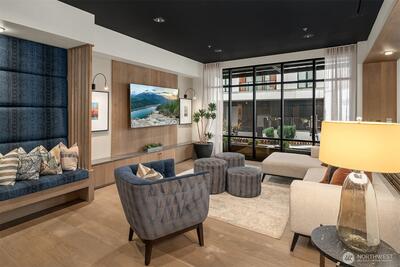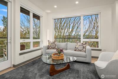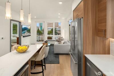 Welcome to Jade, refined condo living in the heart of Totem Lake. This beautifully designed single-level residence features wide-plank engineered hardwood floors, soaring 9-foot ceilings, and an open-concept layout that lives comfortably and elegantly. Expansive windows bring in tons of natural light and frame sweeping territorial views. The chef’s kitchen offers premium Bosch appliances, quartz slab countertops, and a generous island ideal for dining and entertaining. The living area flows seamlessly to a private deck, extending your living space outdoors. The primary suite offers a spa-inspired ensuite bath with tile flooring, quartz counters, and a custom walk-in closet with built-ins. A spacious second bedroom sits adjacent to a full bath with matching finishes. The versatile den provides flexible space for a home office or guest room. Residents enjoy concierge service, a fitness center, clubhouse, rooftop terrace with firepits and grills, dog washing station, EV charging, bike s