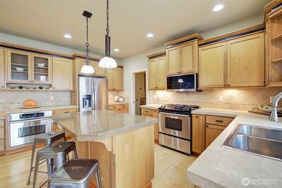 BACK ON THE MARKET AND BETTER THEN EVER! Discover refined living in the desirable Panorama community of Bonney Lake, where comfort, space, and scenic surroundings come together beautifully. This well-appointed home offers 3235 square feet of versatile living space designed for both everyday living and memorable gatherings. The thoughtful floor plan includes 4 spacious bedrooms and 2.5 bathrooms, providing room to relax, work, and host with ease. Large windows invite in natural light and showcase peaceful territorial views, creating a warm and welcoming atmosphere throughout the home. The open kitchen is designed for both function and style, featuring a generous island, gas cooktop, abundant cabinetry, and a casual dining area perfect for morning coffee or evening meals. Recent updates include a **brand-new roof**, adding lasting value and peace of mind. Comfort is ensured year-round with a heat pump, while a cozy fireplace provides the perfect setting for relaxing on cooler Pacific Nor