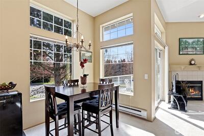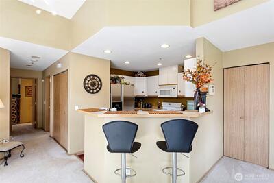 Assumable 3.5% interest loan!!! Welcome home to your hidden lakeview retreat that has unbeatable Mt. Rainier views during clear days and gorgeous sunsets. Kick back and relax on your personal patio after a round at Riverbend Golf Complex, located minutes away! The main bedroom includes a walk-in closet, a private bathroom, and a double sink vanity. The personal chef's kitchen offers an intimate and personalized dining experience, allowing you to plan dinner with friends and loved ones in the comfort of your home. Escape the hustle and bustle of your job and city life with a relaxing evening stroll around one of the many lakes. This unit features rare, vaulted ceilings that help capture all the natural light as it streams in like a warm waterfall. This well-maintained condominium is centrally located, eliminating commute times for your convenience. Don't blink, or you will miss this opportunity to own a beautifully serene move-in-ready condominium!