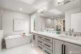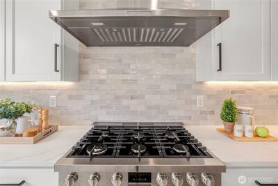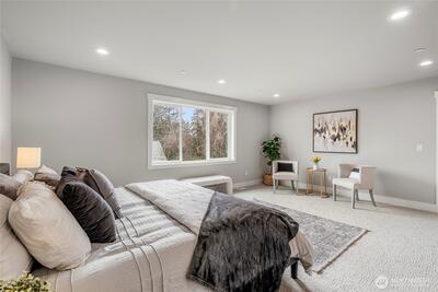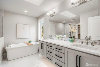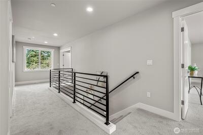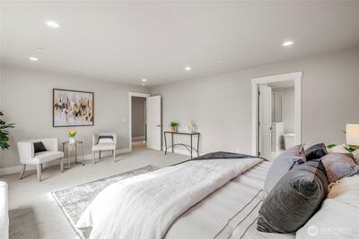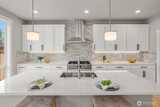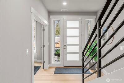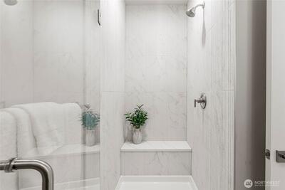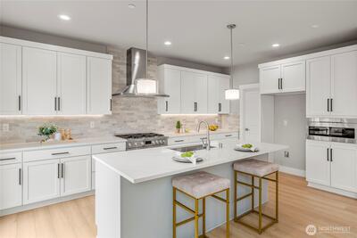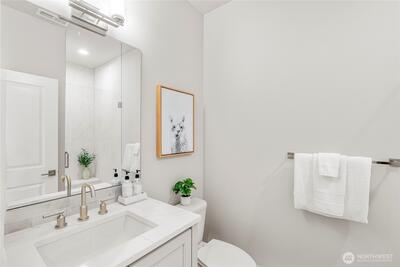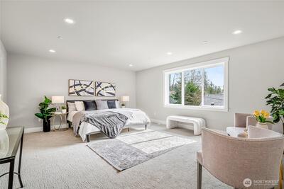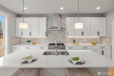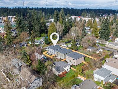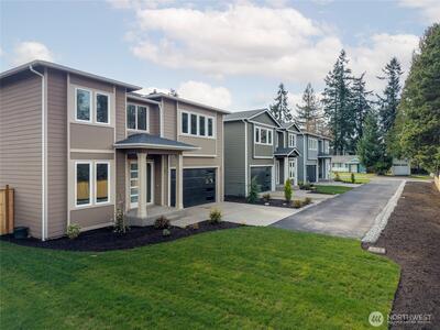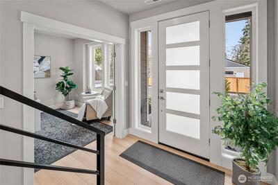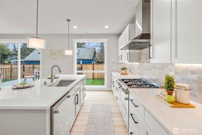 Beautifully designed home, fully fenced and landscaped with a spacious two-car garage. Inside, you will find a versatile main-level den with an adjacent three-quarter bathroom, ideal for guests or a home office. The great room features soaring two-story ceilings, a gas fireplace, and a double slider that opens to the outdoor patio. The kitchen is thoughtfully appointed with stainless steel appliances, including an induction range, generous soft-close cabinetry with under-cabinet lighting, quartz countertops, and a walk-in pantry. The primary suite offers a spa-like five-piece bathroom with a frameless glass shower, a soaking tub, and convenient access to the large laundry room. Two additional bedrooms, a full secondary bathroom with quartz countertops and tile flooring, and a spacious bonus loft complete the upper level. This home is in a prime location surrounded by top-ranked Shoreline schools, Gateway Plaza, grocery stores, parks, and Puget Sound beaches, with quick access to Inters