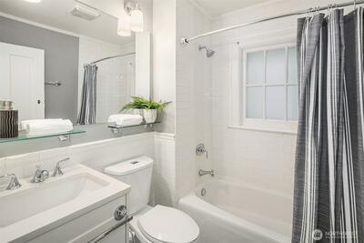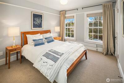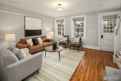 Nestled in the historic Fort Lawton Landmark District in Discovery Park provides a unique blend of history, nature, and community amenities. Restored in 2016, this 1900 home retains its historic allure with modern updates. Spanning 4 levels, the main features an inviting front porch, spacious living & dining areas, and a modern kitchen. The two upper levels offer 3 bedrooms plus full bath, while the lower level offers a flexible space with a ¾ bath. Enjoy peace of mind and convenience with a well-managed HOA with dues covering exterior, grounds, and private road maintenance plus master property insurance with earthquake coverage. With this lock and leave convenience you will love stepping out your door to enjoy the setting in a 534-acre park offering miles of trails, panoramic views of Puget Sound, the Olympics, and beach access. History buffs and nature lovers will find this is more than just a place to live—it's a lifestyle steeped in preservation & natural beauty just 5 miles fro