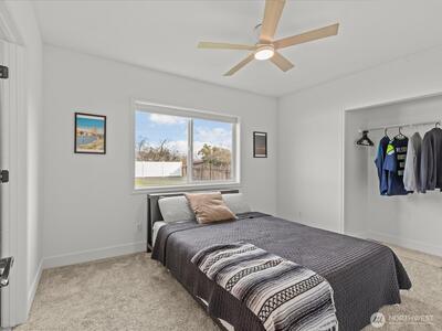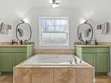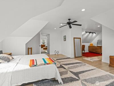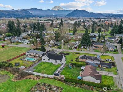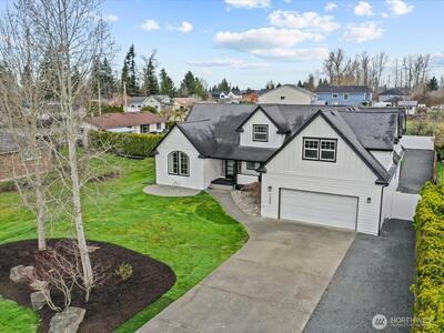 Rare two-primary suite layout located on a spacious .35-acre lot in beautiful Enumclaw. Spanning 2,920 sq ft, this 5-bedroom, 3-bathroom home offers a flexible layout ideal for multigenerational living or a work-from-home space. The main level features a junior primary suite with full private bathroom + 3 additional bedrooms with an additional updated full bathroom. Vaulted ceilings welcome you into the bright living area, flowing seamlessly into the updated kitchen w/added cabinetry, new countertops w/eating bar seating, stove ventilation system, walk-in pantry, beverage fridge, dishwasher, and modern fixtures. A dedicated laundry room with new washer, dryer, and utility sink adds everyday convenience. Upstairs, the SECOND private primary suite retreat boasts 2 walk-in closets, an attached bonus room-perfect for a home office, nursery, gym, dressing room, or private lounge. Across the hall, a large bonus/media room is filled with natural light & offers stunning views of Mt Rainier. Ex