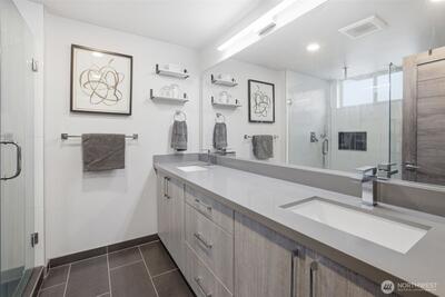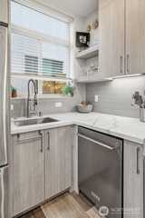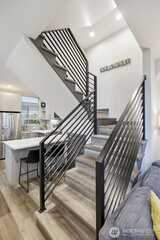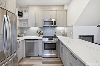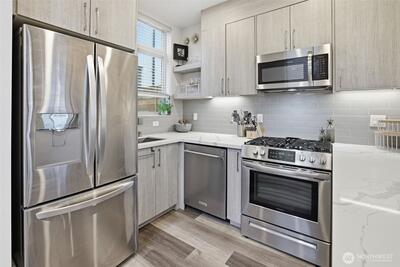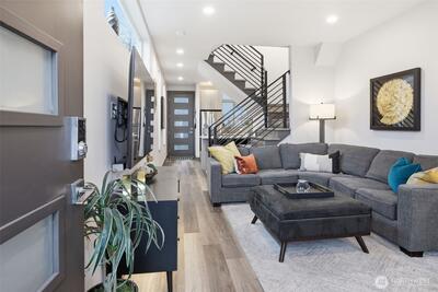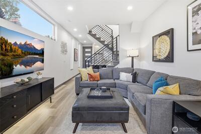 Rooftop sunsets, modern design, and walkable West Seattle living. Built in 2021 and just moments from Morgan Junction, this stylish townhouse offers rooftop Sound views and easy access to cafés, shops, transit, and Lincoln Park.Inside, the open-concept main level is designed for easy living and entertaining, featuring a bright living space and a modern kitchen with upgraded appliances, eat-in counter seating, and a clean contemporary feel. Just off the entry, a small patio offers the perfect spot for a bistro table, plants, or a grill—an easy extension of the living space. Energy-efficient mini-split systems provide heating and AC for year-round comfort.Two bedrooms on the second level share a full bath, ideal for guests, a home office, or flexible living. The upper-level primary suite provides a peaceful retreat with a walk-in closet and spacious ensuite featuring double sinks and a large shower. Thoughtful upgrades include custom closet organizers, integrated smart lighting with v