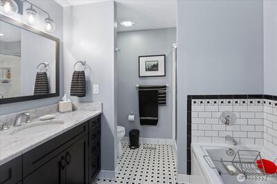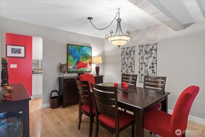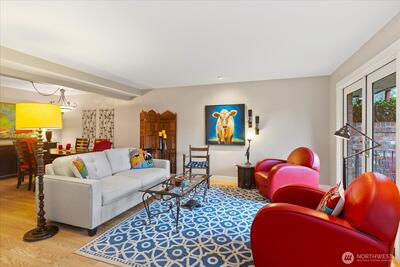 Impeccably maintained 2 bed/1.5 bath townhome in the heart of Richmond Beach. Absolutely immaculate & move-in ready, this light & cheery unit offers thoughtful updates throughout. The kitchen features stainless appliances & chic black granite countertops. The main floor offers warm & welcoming living & dining areas, a beautifully updated half bath & French doors leading to the fully fenced & wonderfully private patio w/calming water feature. The upper level features a large primary bedroom (currently used as an office & sitting area) with an extraordinary amount of closet space. The second bedroom offers a walk-in closet. The full bath w/timeless Carrara marble countertops boasts a jetted tub, generous shower & custom tile work. An added bonus is the "solatube" which provides this bathroom with a surprising amount of natural light! The home's designer touches & fun eclectic flair make it an easy place to feel joy. The gated entry, newer roof, exterior paint & re-coated driveway/parkin