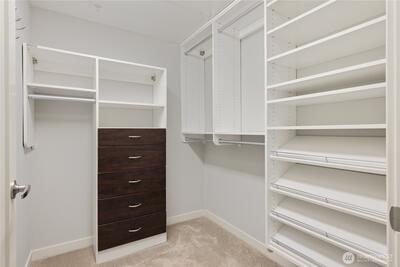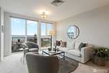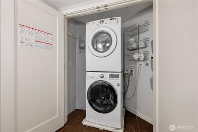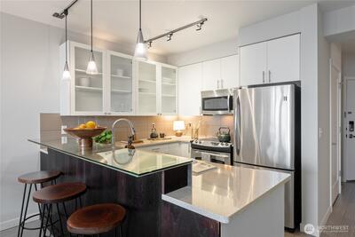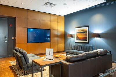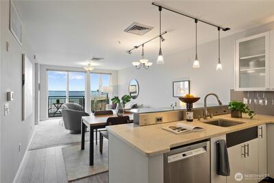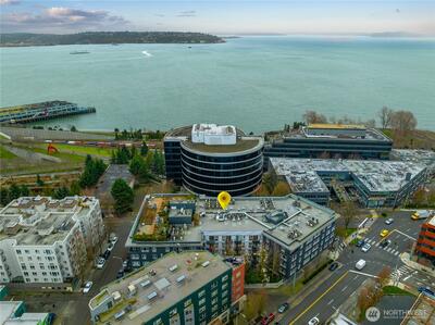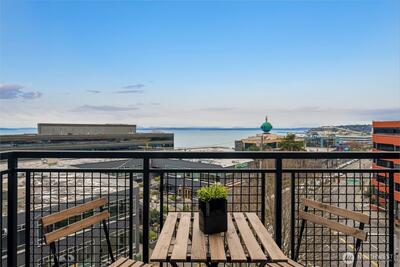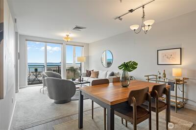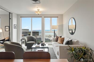 This top-floor corner-unit home faces south and west, and boasts views of Mt. rainier, the Olympic Mountains, and Puget Sound. Even on the grayest of days there is abundant natural light, and when the sun is out there is central air conditioning to keep things cool! The kitchen, dining, and living rooms are all connected and look west to the Olympic Mountains. Wake up to Mt. Rainier views in the ensuite primary bedroom, and enjoy the closet system in the walk-in closet, helping to keep things organized. The second bedroom doubles as a home office, with a Murphy bed that when up, has a drop-down desk. This room faces west, and opens to the living room, helping to create an open and inclusive feeling. Trio condos provides front-desk concierge services, a rooftop deck with BBQs, no rental cap, and is very pet friendly. In the quiet part of Belltown and just steps from the Olympic Sculpture Park, and blocks from Pike Place Market, cafes, nightlife, restaurants, shops, and more!