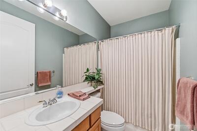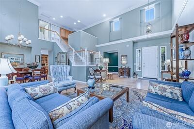 About 3,150 sq.ft., this Maryhill home has a fantastic mix of formal and informal spaces on a level arboretum-like lot backing to a greenbelt. Be greeted by vaulted ceilings, cathedral-like windows, and warm hardwood floors that run through the main floor. The 21-ft. ceilings and walls of windows continue into the family room, bringing inside the lush garden and evergreens beyond. The kitchen has an abundance of cabinets with pull-out shelves, a pantry wall, lots of prep space and an eating space. The huge main-floor primary bedroom has an equally big bathroom that includes two vanities, a steam shower, soaking tub and walk-around closet. The oversized second primary bedroom on the main floor is also en-suite with a walk-in closet. This room is plumbed and could be converted to a studio apt. The large office and laundry room complete the main floor. The upstairs third bedroom has a walk-in closet and adjacent full bath. A loft area on this floor has a built-in workspace. The large deck