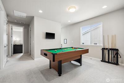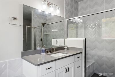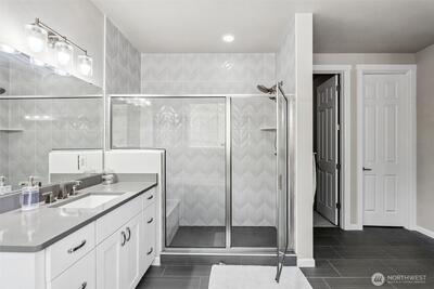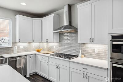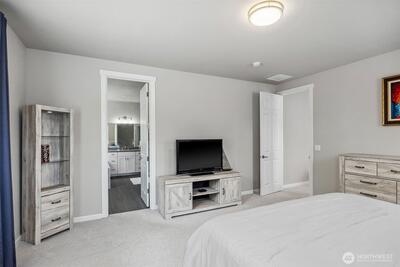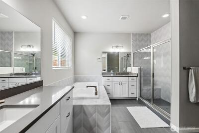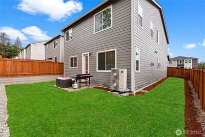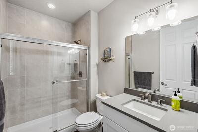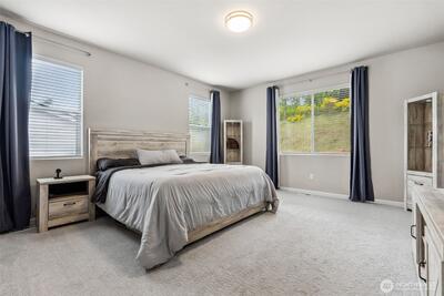 Welcome to this stunning 5 bed, 3 bath home nestled on a cul-de-sac in the desirable North Creek neighborhood of Gig Harbor. Entry with 10 ft ceilings & natural light leads you to an open concept kitchen/dining/living area with gas fireplace. Chef's kitchen w/large kitchen island, quartz countertops, stainless steel appliances, 5 burner gas range, under cabinet lighting, soft close cabinets, & custom light fixtures. On the main floor you will also find a bedroom w/walk-in closet and 3/4 bath w/tiled shower. Oversized primary bedroom upstairs w/large en-suite, double vanity, soaker tub, walk-in shower with custom tile work & walk-in closet. Upstairs has 3 additional oversized bedrooms, full guest bath, loft, and laundry room. Tons of upgrades throughout. Finished 2 car garage with plenty of storage space. Fully fenced backyard w/sprinkler system for front & back. A/C for hot summer days. Close to waterfront, parks, restaurants, YMCA, Costco, I5 & Cushman Trail.