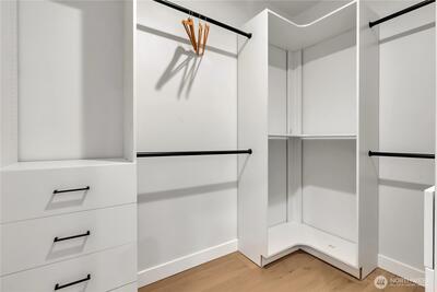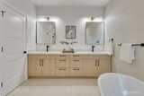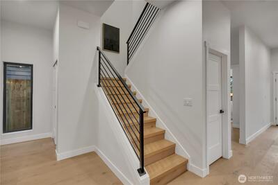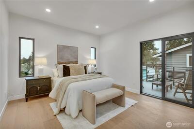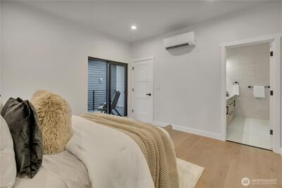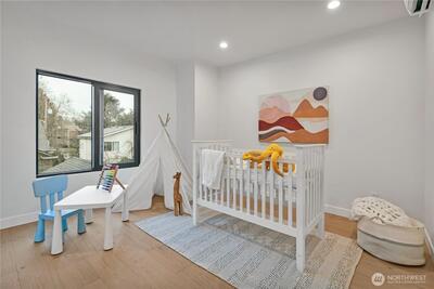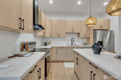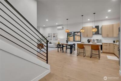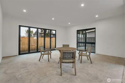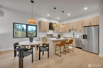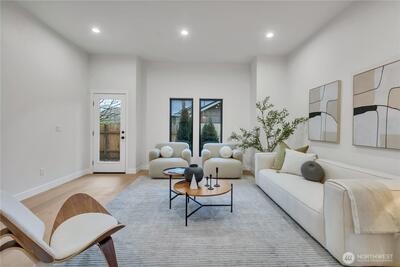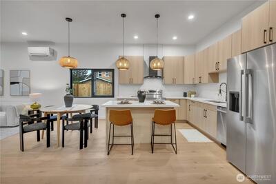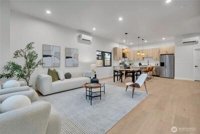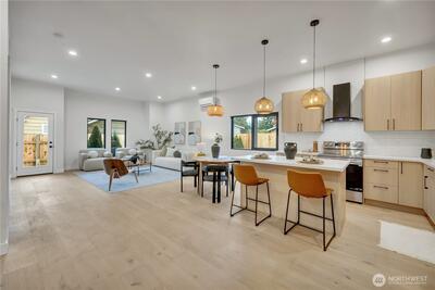 Stunning 2026 new construction designed for modern Seattle living. This light-filled 4-bedroom, 3-bath home showcases soaring 10-ft ceilings, expansive folding doors, and exceptional indoor-outdoor flow to a covered entertaining patio with BBQ area. The open-concept main level features a chef’s kitchen with stainless appliances, statement hood vent, walk-in pantry, and seamless dining and living spaces. A private office and full bath provide flexibility for guests or remote work. Upstairs offers four bedrooms including a luxurious primary retreat with covered balcony, oversized walk-in closet, and spa-inspired five-piece bath. A spacious laundry room with built-in cabinetry adds convenience. Efficient mini-split heat pump comfort, thoughtful layout, and timeless design throughout.