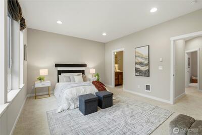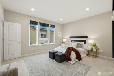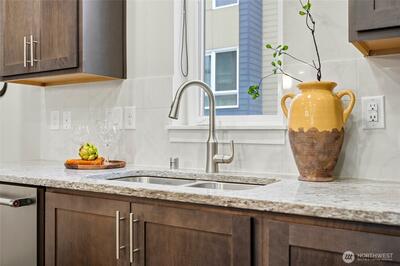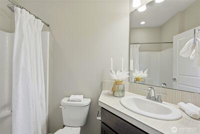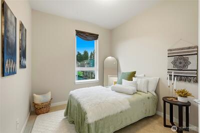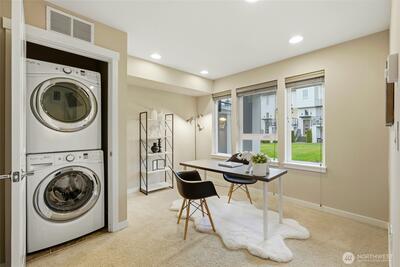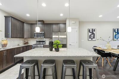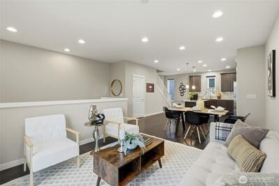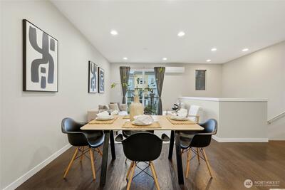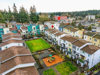 Welcome to 12 Degrees North in Lake Forest Park! This beautifully maintained townhome is located in a newer community featuring an open space, a large community park, bike racks, and more—perfect for modern living.The popular floor plan offers 3 bedrooms, 2.25 baths, and a 2-car garage, with thoughtfully designed living spaces throughout. The main level features an open-concept great room with 9-ft ceilings, abundant natural light, and seamless flow between the living, dining, and kitchen areas. The stylish kitchen includes quartz countertops, a large island, pantry, modern lighting, hardwood flooring, and high-end stainless steel appliances. Step out onto the glass balcony/deck and enjoy peaceful yard views. Upstairs, the spacious primary suite includes a well-appointed ensuite bath and walk-in closet, along with two additional bedrooms and a full bath. The street-level flex space offers an ideal for a home office or studio with covered patio. Additional features include a mini-spli