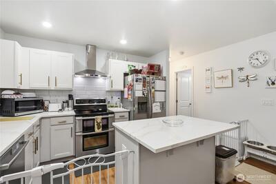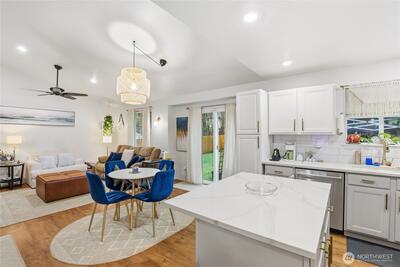 Enter into this beautifully remodeled home showcasing a true designer’s eye for detail. The stunning kitchen features plenty of cabinetry with elegant gold pulls, 3 cm quartz countertops, classic subway tile, and newer stainless steel appliances—blending style and function seamlessly. Both full bathrooms shine with vessel sinks and exquisite tile work, creating a polished, spa-like feel. The inviting living area offers built-in shelving, vaulted ceilings, ceiling fans, and durable vinyl plank flooring that flows throughout the home. Enjoy year-round comfort with central heating and AC, ensuring the home stays cozy in the winter and cool in the summer. Outside, you’ll find a spacious fully fenced backyard complete with a large patio, fire pit, and storage shed—perfect for entertaining or relaxing. Additional highlights include a 2-car garage and convenient RV parking. Ideally located for an easy commute to PSNS, JBLM, and nearby shopping in Port Orchard and Gig Harbor.