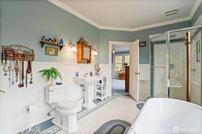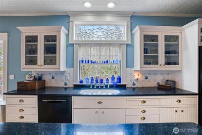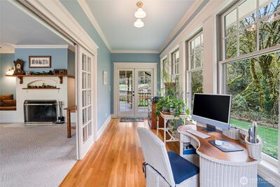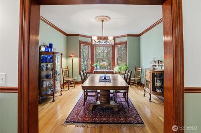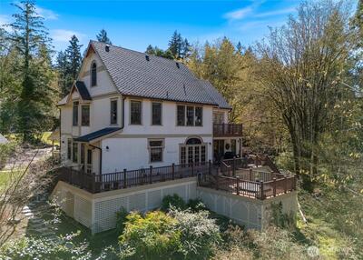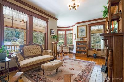 Stunning storybook custom-built Victorian estate in Gig Harbor is on the market for the very first time! Step into a timeless escape where quality craftsmanship, character, & quiet luxury come together perfectly. Nestled on 3.61 acres across two parcels, this home feels like a private retreat with its peaceful seclusion surrounded by natural beauty. Inside, over 5000 sq. ft. unfolds with intention & grace, from the elegant parlor & formal dining room to the warm, welcoming kitchen crowned with a classic tin ceiling. Oak hardwood floors run underfoot, while leaded & stained glass windows cast soft, colorful light throughout. Rich, solid wood millwork & custom cabinetry speak to the level of craftsmanship honored here. This home offers 4 bedrooms, 3 baths, a dedicated office, & an expansive lower-level perfect for gathering, entertaining, or simply spreading out. An unfinished attic provides abundant storage & future potential. Outside, the home's architectural presence is unforgettable.