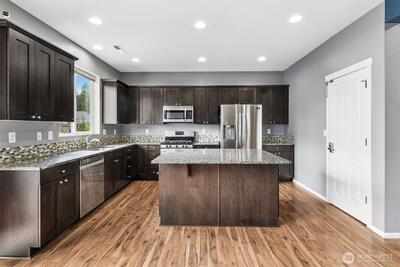 This stunning 3-story home in the desirable Terra Woods community of Puyallup offers the perfect blend of space, comfort, and style! The main level welcomes you with a formal dining area that seamlessly connects to a warm and inviting family room—ideal for both everyday living and entertaining. The chef’s kitchen is a true standout, featuring granite countertops, a stylish tile backsplash, stainless steel appliances, and ample space for cooking and gathering. A convenient powder bath completes the main floor. Upstairs, you’ll find three generously sized guest bedrooms, a full bath, and a serene primary suite complete with a luxurious 5-piece ensuite bath and walk-in closet + an additional loft space—perfect for a home office, reading nook, or flex area. The third floor offers an expansive bonus/rec room with vaulted ceilings and a closet, providing endless possibilities for a media room, playroom, or guest retreat. Step outside to your private backyard, fully fenced and thought