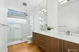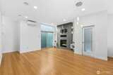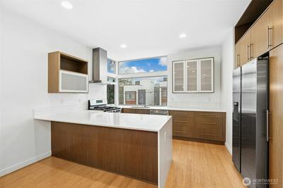This modern Seattle home blends comfort, efficiency, and style in a prime location near restaurants, shops, parks, schools, and transit. South facing windows fill every level with natural light. It features 3 bedrooms and 2.5 bathrooms, including a spacious top-floor primary suite with a luxury ensuite, dual sinks, rain shower, 2nd spa shower head, & walk-in closet. The open-concept main level offers a bright living room with a gas fireplace and inwall 7.1 channel home-theater cabling (with 2 in-ceiling surround speakers). The dining area sits beside the large kitchen, featuring stainless steel appliances, a gas range, and ample storage. Enjoy a private covered patio, two balconies on the 2nd floor, and a large rooftop deck (engineered for a hot tub with structural supports, electrical, and hot/cold water hookups) with unobstructed views, perfect spaces for relaxing or entertaining. Additional highlights include bamboo floors, hydronic radiant floor heating with independent zones per
