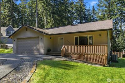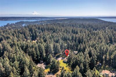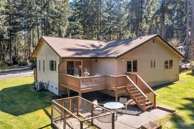 Discover the charm of island living in this Fox Island 1.4 acre home nestled on a long meandering driveway amongst nature & serenity. Step inside to discover a light-filled interior with expansive windows that frame the natural surroundings & invite the outdoors in. The thoughtfully designed layout features generous living spaces, ideal for both relaxed living & comfort. A well appointed kitchen offers ample counter space, quality finishes, functionality & seamless flow into the dining + gathering areas. The dining room overlooks the lush landscape & adjoins to the entertaining deck accessing the fully fenced backyard. The oversized primary suite provides a peaceful escape, complete with picturesque landscape views, walk-in closet & 3/4 bath. Additional bedrooms offer flexibility for guests, home office, or multi-generational living. Enjoy your acreage oasis with level lawn spaces, evening by the fire-pit or relaxing on your private deck. Located just minutes from the bridge, beaches,