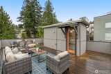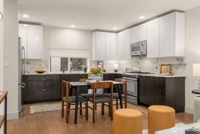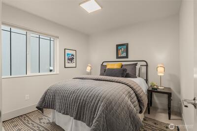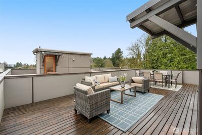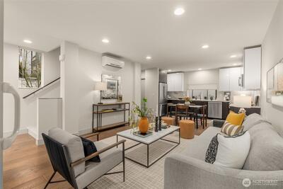 Experience modern living at its finest in this stunning Queen Anne Hill townhome. Built in 2015 and thoughtfully designed with a sleek, open layout flooded with natural light, this 3-Star Green Built home delivers the perfect balance of contemporary style and everyday sustainability — without sacrificing an ounce of comfort. The entry level offers a versatile room ideal as a home office or guest bedroom — complete with an ensuite ¾ bath — along with the convenience of an attached 1-car garage. Head upstairs to the heart of the home, where the main living floor opens up beautifully. The chef's kitchen is outfitted with stainless steel appliances and sleek quartz countertops, and flows seamlessly into the living room. Rich wood floors anchor the room, which spills out onto a private deck - perfect for morning coffee or an evening glass of wine. A powder room tucked conveniently nearby rounds out the level that’s as functional as it is inviting. The upper level is where you'll re
