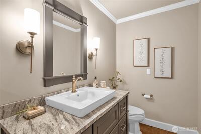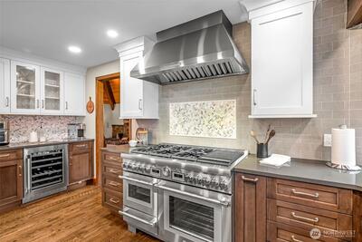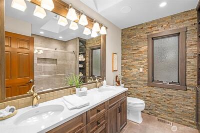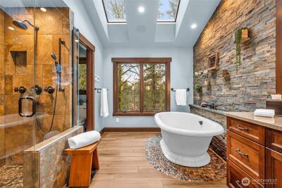 Experience the perfect harmony of sophisticated design and natural serenity in this masterfully reimagined NW Craftsman. Nestled in the heart of Sammamish, this estate isn’t just a home; it’s a private sanctuary designed for a life of effortless connection and quiet luxury. The main level is a masterclass in flow, where a stunningly remodeled kitchen featuring a black walnut eating bar, professional-grade Thermador appliances & expansive island opens into a family room anchored by a warm gas fireplace. Whether hosting formal dinners or casual Sunday brunches, the space transitions effortlessly between elegance and comfort. Upstairs, the primary suite is a true retreat, showcasing vaulted cedar ceilings and a spa-like bathroom with heated floors, a soaking tub, and a rainfall shower that rivals the world's finest resorts. Entertainment is elevated to an art form on the lower level, which features a dedicated theater room, a wet bar, and a high-tech integrated speaker system througho
