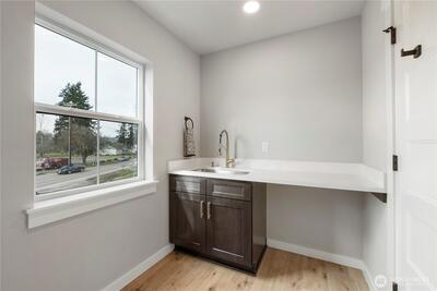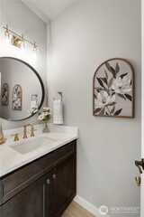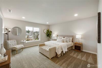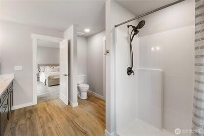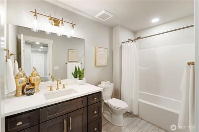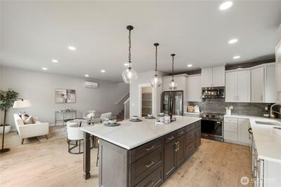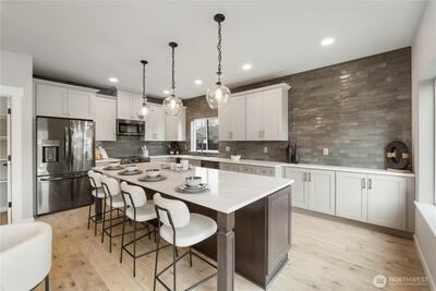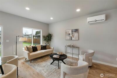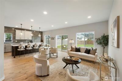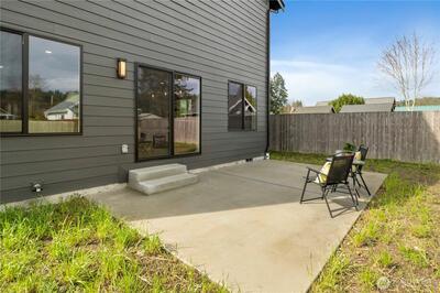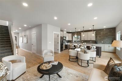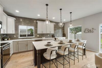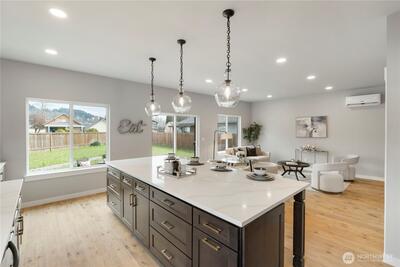 New construction alert in Orting! 1,850 SF 3 bedroom, 2.25 bath w/ insulated 2-car attached garage. Waterproof LVP flooring throughout the main w/ well-appointed kitchen, slab Quartz countertops, island bar seating, dining area & slider to back patio. Half bath downstairs w/ quartz countertops. Owner's suite w/ private bath, tile floor, linen cab & Quartz countertops on the huge dual sink vanity. Large walk-in closet off of primary bath. Guest full bath & utility room up plus 2 more good sized bedrooms w/ insulated interior walls upstairs for quieter spaces. Hardi-plank siding. Forced air/mini-split heat pump and AC system. Walking distance to downtown Orting shops, restaurants & Rails to Trails.