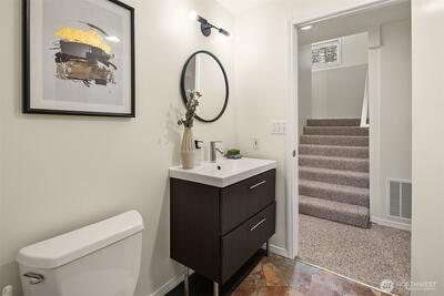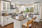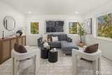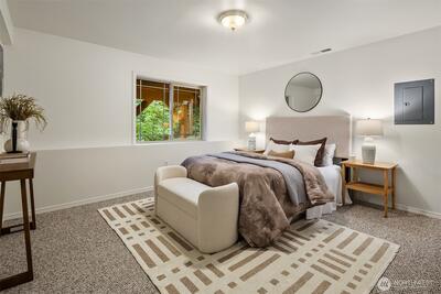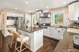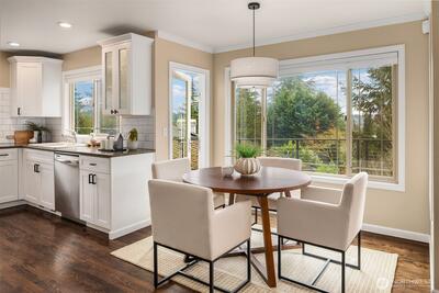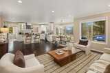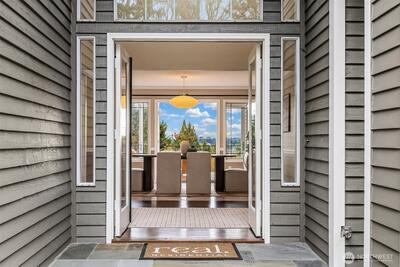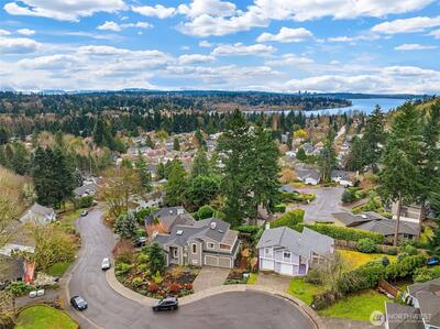 Nestled at the end of a peaceful cul-de-sac in the desirable Hazel Lane neighborhood, this light-filled home captures sweeping views of Mount Rainier, Lake Washington, and the city skyline. Step inside to soaring ceilings, hardwood floors, and expansive windows, where your gaze carries through the living spaces to the deck and stunning vistas. The main floor features a thoughtfully designed kitchen with a generous island, a cozy living room area anchored by a fireplace, an office, and a dining area with French doors opening to the deck-perfect for indoor-outdoor entertaining or serene mornings overlooking professionally landscaped gardens.Upstairs, three bedrooms include a primary suite with a sitting nook, spa-inspired bath, walk-in closet, and incredible mountain and lake views. Two additional bedrooms are bright and spacious, share a full bathroom, and offer access to a second deck.The fully finished, permitted 2-bedroom ADU on the lower level has a private entrance, has been freshl