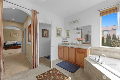 Beautiful 4-bedroom, 2.75 bath home located in a quiet half cul-de-sac setting offering space, comfort, and a functional layout. The kitchen features a custom walk-in pantry, floating island, and upgraded appliances, perfect for everyday living and entertaining. The main floor includes fresh interior paint and a bedroom with an adjacent 3/4 bath, ideal for guests or multi-generational living. Central A/C adds year-round comfort. The spacious primary suite features vaulted ceilings, a 5-piece bath, and two walk-in closets. The backyard provides plenty of space for outdoor enjoyment with an expansive concrete patio and room to relax or entertain. Conveniently located near freeways, shopping, and highly rated Dieringer schools, this home offers the perfect blend of location, layout, and livability.