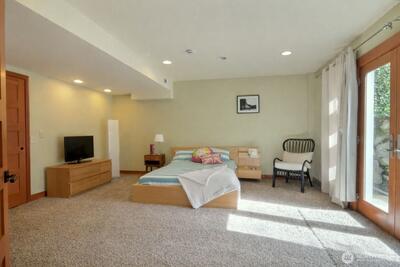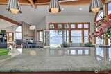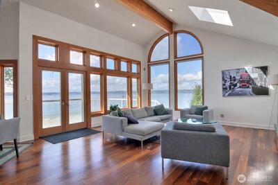 166 feet of low-bank, west-facing waterfront on Henderson Bay with stunning Olympic Mountain views and unforgettable sunsets. Tucked away for privacy, yet just minutes from Gig Harbor amenities, this home offers the perfect blend of peaceful waterfront living and everyday convenience. Step inside to a dramatic great room with soaring ceilings, exposed beams, Brazilian hardwood floors, and walls of windows capturing the beauty of the bay. The spacious deck invites you to relax, entertain, and enjoy summer evenings on the water. The main-level primary suite offers a private retreat with a large walk-in closet, spa-like bath, and its own deck—perfect for morning coffee or unwinding in the hot tub. The kitchen features marble countertops, an eating bar, and a generous walk-in pantry. Upstairs includes additional bedrooms, a full bath, a light-filled bonus room, and a private guest suite with kitchenette—ideal for visitors or multi-generational living. A rare opportunity to enjoy the