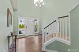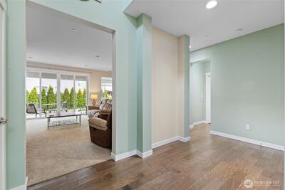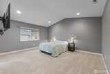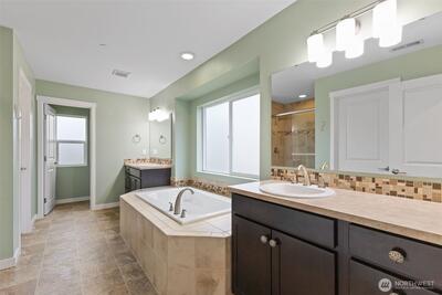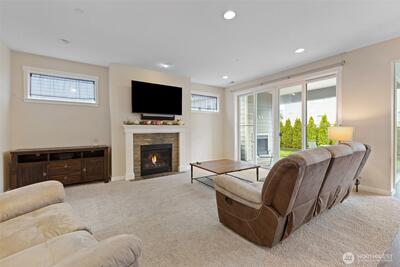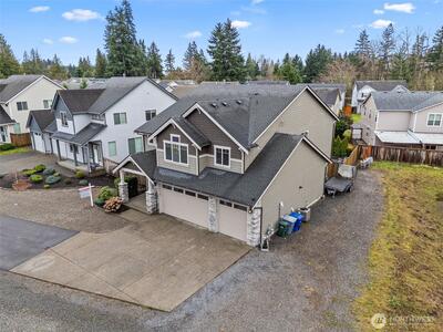 Beautiful 5-bedroom, 2.75-bath home in Bonney Lake with a versatile bedroom on the main level and a 3/4 bathroom! This thoughtfully designed home features an open-concept great room with French sliding glass doors leading to a covered patio complete with a cozy fireplace—perfect for year-round entertaining. Recessed lighting throughout and central A/C provide comfort and modern convenience. The chef’s kitchen boasts a large island, quartz countertops, 42” cabinets, full-height tile backsplash, butler's pantry and a walk-in pantry. All newer stainless appliances including built-in oven and microwave, dishwasher and refrigerator, pendant lighting and hardwood flooring. Upstairs, enjoy a spacious primary suite with vaulted ceilings, wall mounted Flat screen TV, a luxurious bath featuring soaking tub 5-foot shower dual vanities and sinks with two walk-in closets. Three additional bedrooms and a generous bonus room with large wall mounted flatscreen TV to provide plenty of space for e