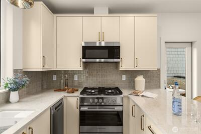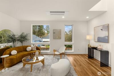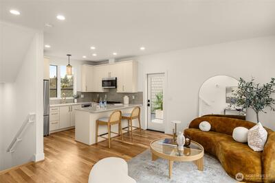 Thoughtfully designed new construction townhome in the heart of Magnolia, combining modern style, functional living, and rare private garage parking. This 1,125 SF home lives larger than its footprint thanks to an efficient layout and smart separation of space. The entry level features a private entrance and versatile bedroom or flex space with a full bath, ideal for guests, remote work, or flexible use. The main living level is bright and open, featuring a modern kitchen, dining area, and comfortable living space that flows to an unusually large private deck. Rare for homes of this type, the expansive outdoor space creates seamless indoor-outdoor living and provides the perfect setting for year-round Pacific Northwest enjoyment. The top floor is dedicated to the primary suite with a walk-in closet and private bath, creating a quiet retreat above the main living areas. Quality finishes throughout include quartz countertops, real oak hardwood floors, CAT5 wiring, security system, and de