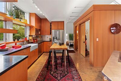 The Best Home in Bothell! Set on over an acre in the sought-after Norway Hills community of Tate's Orchard, this elegant contemporary home reflects the timeless design principles of Rhodes Architecture, where natural light, privacy, and connection to the landscape define everyday living. Thoughtfully sited on a spacious lot, the home offers a rare sense of retreat while remaining close to Bothell, Woodinville, and Eastside amenities. Designed to stand the test of time, the architecture creates a seamless indoor-outdoor flow with expansive windows, warm natural materials, and inviting gathering spaces. The gourmet kitchen features granite counters, stainless appliances, and radiant heated concrete floors, opening to living areas with indoor & outdoor fireplaces perfect for year-round entertaining. The separate pergola off the main patio offers even more outdoor entertaining. The sumptuous primary suite showcases extraordinary woodwork, a spa-inspired bath with soaking tub, and an oversi