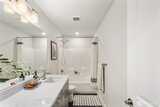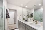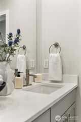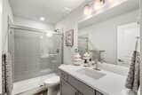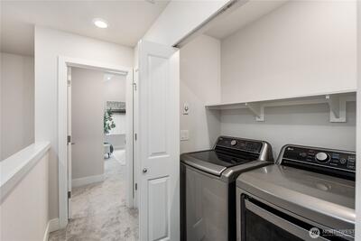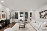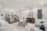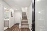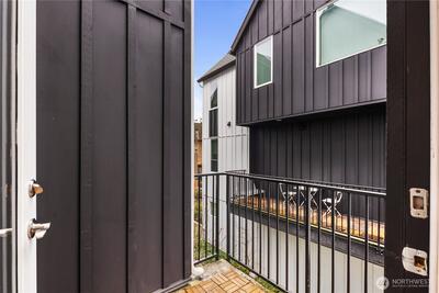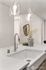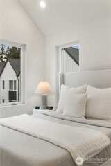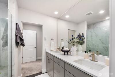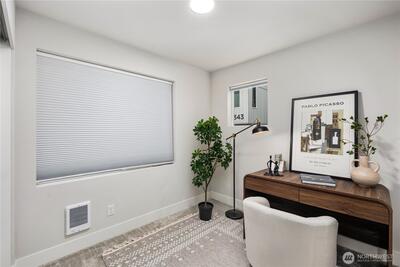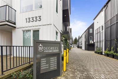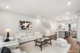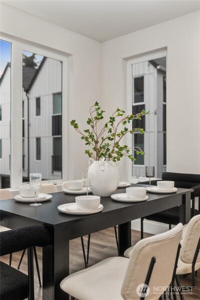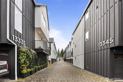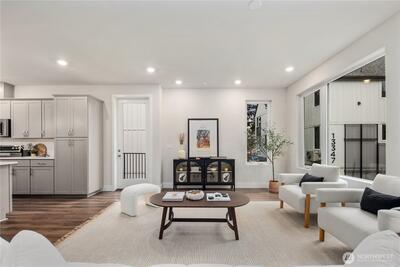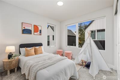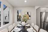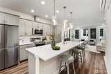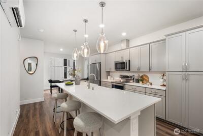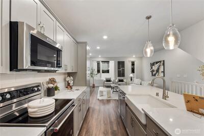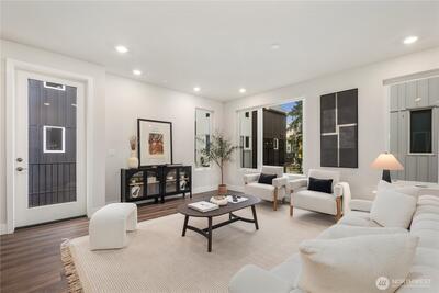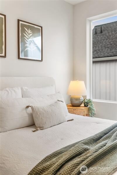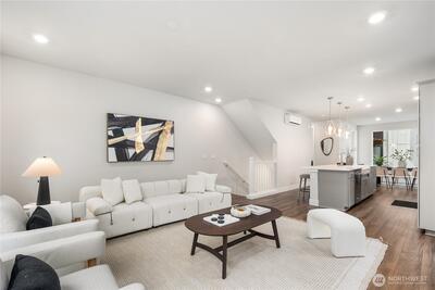 Pulte Homes new construction resale offering a rare corner end unit offering a wider, more livable layout than typical Seattle townhomes, quietly tucked away from the main road for added privacy. Built in 2021 but occupied in 2023, this thoughtfully maintained home blends modern design with everyday functionality. The open concept main level is anchored by a chef’s kitchen featuring an oversized 10ft quartz island, white soft close cabinetry, farmhouse sink, and premium KitchenAid appliances with Samsung refrigerator, flowing seamlessly into sunlit living and dining spaces framed by expansive windows unique to its corner positioning. Enjoy indoor outdoor living with 2 covered balcony’s off the main level, ideal for year round use, entertaining, or unwinding. Upstairs, the vaulted primary suite offers a spa-inspired retreat with dual vanities, floor to ceiling tiled shower with bench, frameless glass enclosure, and a generous walk in closet. Spacious secondary bedrooms provide flexi