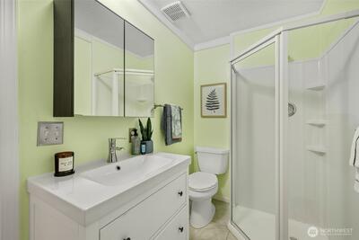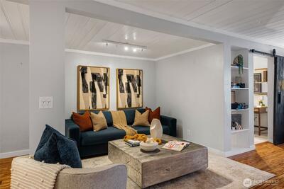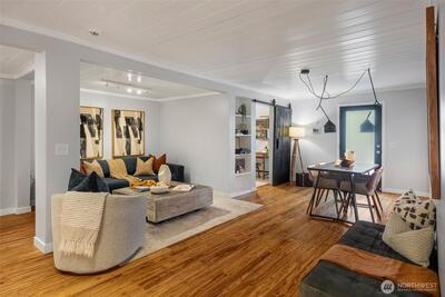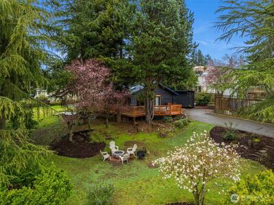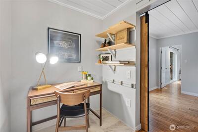 Welcome to this beautifully updated one-level home situated on a spacious corner lot in Des Moines. Offering partial water views and a serene, coastal-inspired ambiance, this property blends comfort, style, and versatility. Step inside to an open-concept layout designed for effortless living and entertaining. The kitchen flows seamlessly into the main living and dining areas, creating an inviting space with plenty of room to gather. Thoughtfully selected finishes throughout the home evoke the charm of a stylish European retreat, adding warmth and character at every turn. The fully remodeled primary suite is a true highlight, featuring a luxurious bathroom and a well-designed closet that offers both function and style. An office nook just off the dining area provides the perfect work-from-home setup without sacrificing flow or space. Outside, the backyard is ideal for entertaining, gardening, or simply relaxing. A detached structure offers endless possibilities—whether you envision a