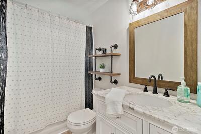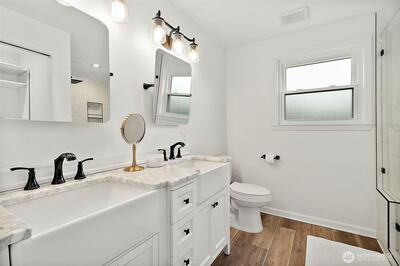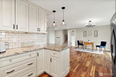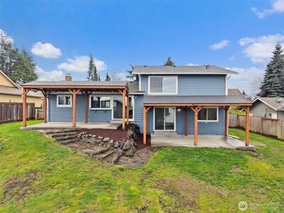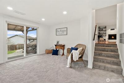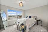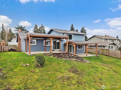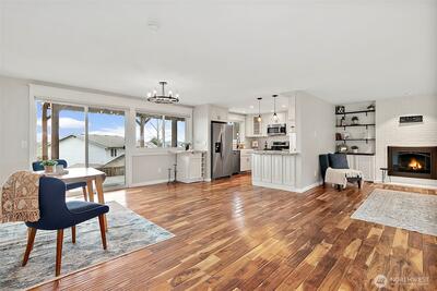Beautifully updated 4-bedroom, 2.5-bath home blending modern style with functional living. Fresh interior paint, new carpet, newer windows, newer furnace, and new exterior siding and paint create a crisp, move-in-ready feel. Main level features engineered hardwood flooring, abundant natural light, and an open-concept living and dining area alongside an updated kitchen with white cabinetry, slab granite countertops, stainless steel appliances, and pantry. Spacious primary suite offers an en suite bath and dual closets, including a walk-in. Lower level includes a versatile family room, separate laundry room, 4th bedroom, and access to the attached 2-car garage. Recent improvements include a newer roof, newer plumbing updates, newer hot water heater, newer driveway, and additional kitchen updates. Saltwater and mountain views add to the appeal, while the fully fenced backyard offers a covered concrete patio, in-ground sprinkler system, and room to relax, entertain, or create a future hot
