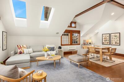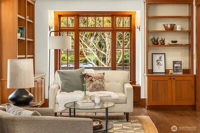 Fabulous, like-new shingled Madrona home in superb condition nestled atop the hill- Stylish residence with Beautiful finish work throughout found in all rooms and sophisticated, elegant floor plan. Kitchen-family room offers outdoor dining, cozy fireplace, as well as top of the line appliances including new Wolf range-oven. Large kitchen island, pretty dining room. Gucci-papered powder room! Expansive primary suite with balcony, and sun-filled bath. Two additional bedrooms on second level, each quite spacious, and a bedroom/ bath on third floor adjacent to the rare and inviting top floor bonus room. Spacious deck with "bridge to bridge" panoramic Lake Washington and Cascade views. The very special detached studio space is ideal for home office, exercise, retreat or playroom! Quality construction with oak floors, excellent wood windows and French doors. EV Car Charger. Two-car tandem garage. Gas furnace and mini-splits with AC. Friendly neighborhood locale close to the best of popular