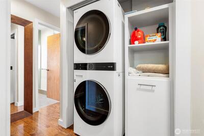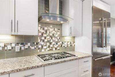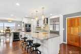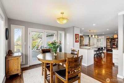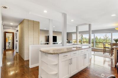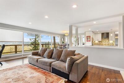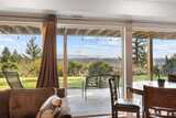 Enjoy breathtaking Mt. Rainier views from this beautifully updated Mid-Century residence that perfectly blends timeless architecture with thoughtful modern upgrades and versatile living spaces. The light-filled open-concept main level showcases expansive windows, spacious living and dining areas, and a chef-inspired kitchen featuring premium Thermador appliances, abundant cabinetry, and an oversized walk-in pantry with custom organization, all designed for both everyday living and effortless entertaining. Step outside to the expansive view deck, ideal for hosting gatherings, enjoying sunsets, or simply taking in the incredible mountain scenery. The lower level offers a fully equipped private suite with its own entrance and kitchen, creating an ideal setup for multi-generational living, guests, or extended stays. Additional features include a dedicated workout room, wine cellar, two sets of washers and dryers, air conditioning, newer insulation, beverage refrigerator, durable metal roof
