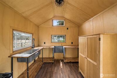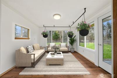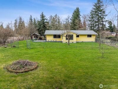 Tucked away in your own private oasis, but close to shopping, dining, freeways- this remodeled rambler on a level shy acre has it all! As you pull in, the tree lined driveway makes you feel like you're about to unplug from the daily grind. This 1728 SF home has been freshly painted inside with 3 bedrooms, 2 completely updated bathrooms, Sunroom, extra den/ flex space, updated kitchen with gas range & large laundry room with lots of storage. New Luxury Vinyl Plank throughout, New mini split ductless heating & cooling, Tesla charger in the 2 car attached garage, new H2O tank are just some of many updates this home boasts, making this the obvious choice. Outside you'll not only love the gorgeous landscaping with fruit trees, perennial border and raised beds, you'll also fall in love with the charming outbuilding fitted with electrical outlets, heat, sink & more to make it into your own special space. Newer roof (2022 install).This property is adjacent to Pierce Co public land/ wetlands, s