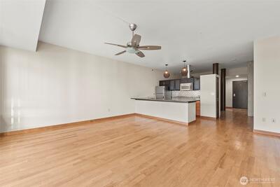 Commanding breathtaking views of Puget Sound from the coveted south-facing 10th-floor sub-penthouse, this residence captures a refined urban lifestyle framed by floor-to-ceiling windows and a stunning panorama of Mt. Rainier, passing ferries, and unforgettable sunsets.An open-concept living, dining, and kitchen layout is thoughtfully designed to showcase the water and mountain views at every turn, while the private balcony provides a front-row seat to shimmering city lights after dark.High-end finishes elevate the home throughout, including tilt-and-turn windows and doors, solid hardwood floors, soaring 10-foot ceilings, a contemporary chef’s kitchen, and a sleek, fully tiled modern bathroom.Residents enjoy a beautifully designed bi-level lobby with concierge service and access to premium amenities, including a fitness center, community room, business lounge, outdoor patio, and guest suite.Ideally located just steps from Olympic Sculpture Park, the revitalized waterfront, world-class