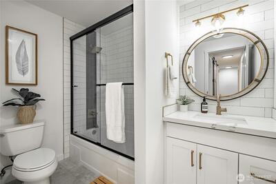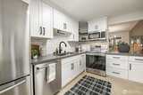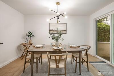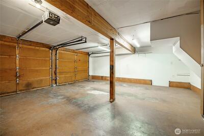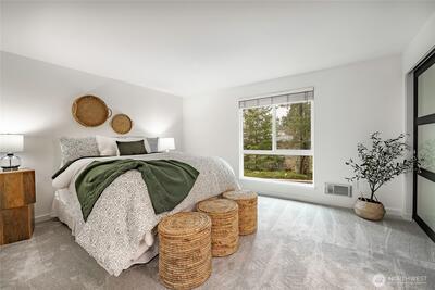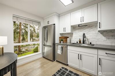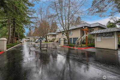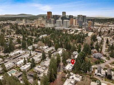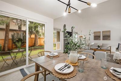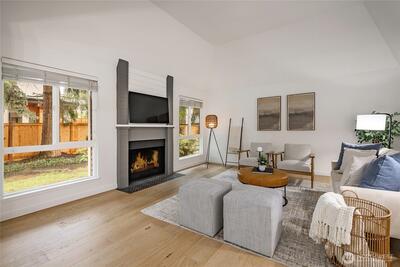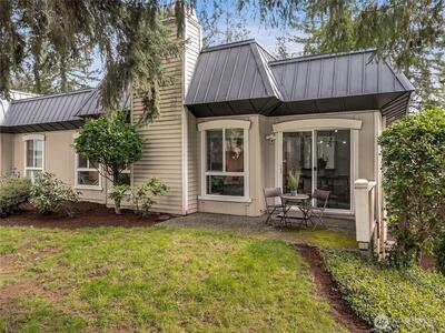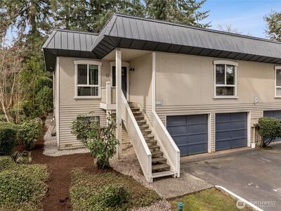 This rare EAST facing, tastefully remodeled, end-unit townhome delivers the privacy of a single-family home with the ease of low-maintenance living at one of the Eastside's most coveted addresses. Positioned at the end of the row, minimal shared walls, and a sense of space interior units simply can't match. The attached two-car garage + driveway park, and direct interior staircase access is a standout feature - no navigating the outdoors to unload groceries or head out on a rainy morning. Inside, vaulted ceilings & oversized windows frame treetop views & fill the living rm w/ warm natural light all day. The open kitchen features white cabinetry, SS apps, and a layout that flows seamlessly into the dining and living areas - perfect for entertaining or a quiet evening. A glass slider opens to a private patio with a grassy surround and mature trees providing shade & seclusion. The home offers two generous bedrooms and two full bathrooms, a versatile lower-level bonus room that adapts eas